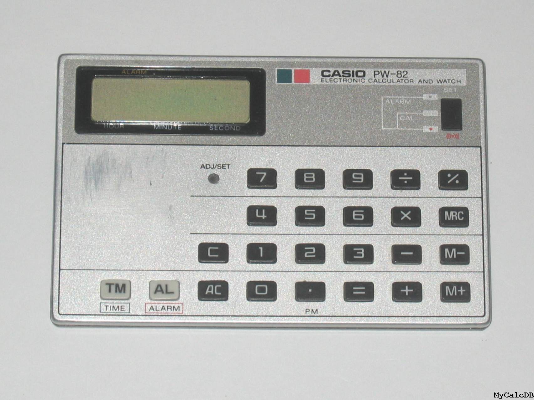 The Casio PW-82 is an arithmetic calculator with 8 digits precision and algebraic logic. It has 5 mathematical functions, 26 keys and an LCD (liquid crystal) display. Notably, it also functions as a pocket watch with an alarm function.