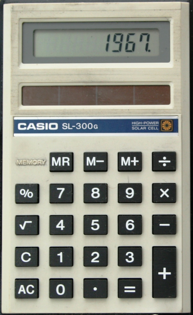 The Casio SL-300G is an arithmetic calculator with 8 digits precision and algebraic logic. It has 6 functions, 23 keys and an LCD (liquid crystal) display. The power source is Solar. The calculator was manufactured in Japan.