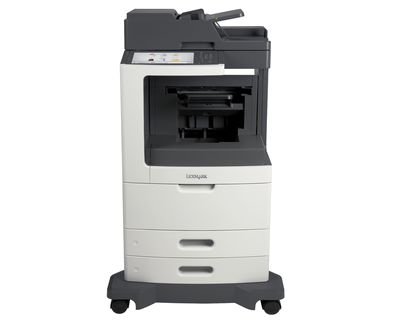 The Lexmark MX812dfe MFP with a customizable e-Task touch screen provides print, copy, fax, scan and email functions. Included are a staple finisher, 1,200-sheet standard input, 1GB of standard memory and a 160+GB hard disk.
