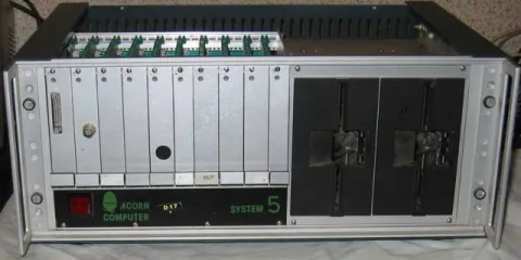 The Acorn System 5 was the final Acorn rack-mounted system, released in 1983. It was mounted in an extra-height single 19" frame, which could accommodate two vertically mounted 5" floppy drives, with either seven or ten Eurocard slots. It came complete with a power supply, and was only available fully assembled. As standard it had a 1 MHz 6502, 32K DRAM, a disk controller, and either the 80x25 or the Teletext 40x25 VDU cards. Customers could choose which cards to install in the remaining slots, including interface cards, an additional 16K DRAM card, and/or an Econet network adapter; they could also choose to upgrade the processor board to a faster 2 MHz 6502 board.