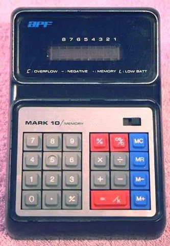 The APF MARK 10 is an arithmetic calculator with 8 digits precision and algebraic logic. It has 6 functions, 23 keys and a VFD (vacuum fluorescent) display. The power source is 4xAA batteries.