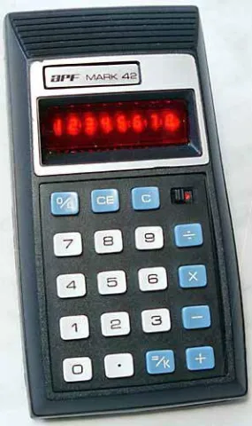The APF MARK 42 is an arithmetic calculator with 8 digits precision and algebraic logic. It has 5 functions, 19 keys and an LED (light-emitting diode) display, typical of calculators of this era. The power source is PP3 9V.