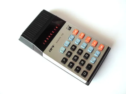 The APF MARK 72 is an arithmetic calculator with 8 digits precision and algebraic logic. It has 6 functions, 24 keys and an LED (light-emitting diode) display, typical of calculators of this era. The power source is PP3 9V. The calculator was manufactured in Hong Kong.