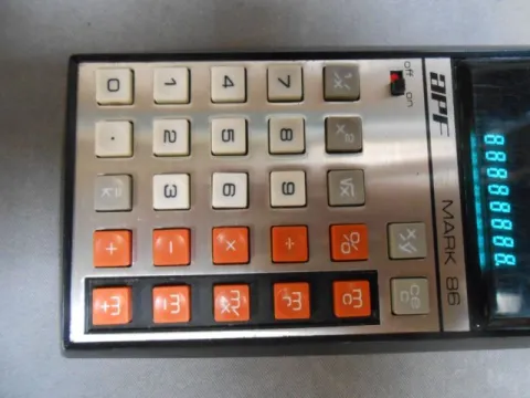 The APF MARK 86 is an arithmetic calculator with 8 digits precision and algebraic logic. It has 9 functions, 27 keys and a VFD (vacuum fluorescent) display. The power source is 3xAAA batteries.