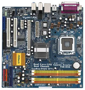 The 945G chipset used by ASRock in their ConRoe945G-DVI motherboard is over a year old, and it is paired with the Intel ICH7.