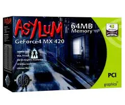 Asylum GeForce4 MX 420 is a glorious place to begin your 3D PC adventures!This is a cost-effective, yet powerful video card for you. 64MB of 166MHz SDR RAM, 31 million triangles per second, a TV-out connector and 2.7GB memory bandwidth! Your 3D applications will flourish with Asylum graphics in control.