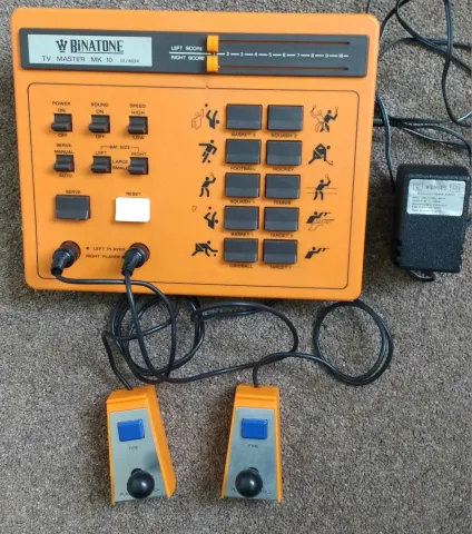 All HardwareThis pong is one of the many Binatone systems. As its name indicates, it offers 10 games : 8 pong games (basket 1, basket 2, gridball, squash 1, squash 2, football, tennis, ice hockey) and 2 shooting games (target 1, target 2). It is the most complete of the Binatone TV Master series (black & white pongs).
