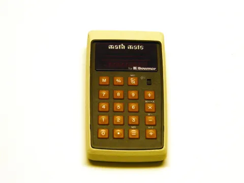The Bowmar math mate mathmate is an arithmetic calculator with 8 digits precision and algebraic logic. It has 5 functions, 18 keys and an LED (light-emitting diode) display, typical of calculators of this era.
