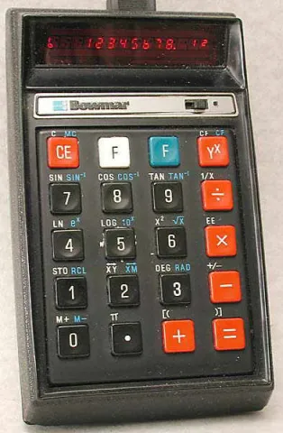 The Bowmar MX140 is a scientific calculator with 10 digits precision and algebraic logic. It has 25 functions, 20 keys and an LED (light-emitting diode) display, typical of calculators of this era. The power source is Sealed battery pack.