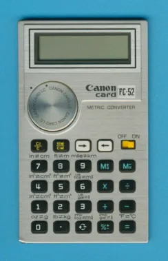 This Canon FC-52 was probably introduced together with the FC-42 and started with its "sibbling" Toshiba LC-838 a long line of Metric Converter calculators based on Integrated Circuits (IC's) developed by Toshiba. Canon introduced already in 1974 with the FC-80 their first metric conversion product with a LED display based on a calculator chip developed by Hitachi.