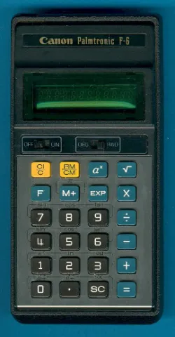 The Palmtronic F-6 continued the scientific line of calculators sold by Canon. It is the direct successor of the F-5 and uses again a "TI-less" calculator brain. The major design in the housing was continued with calculators like the F-2, LD-10M, Palmtronic F-31 and LC-8M.