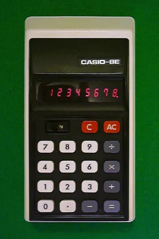 The Casio 8E CASIO-8E is an arithmetic calculator with 8 digits precision and algebraic logic. It has 4 functions, 18 keys and an LED (light-emitting diode) display, typical of calculators of this era. The power source is 4xAA batteries. The calculator was manufactured in Japan.