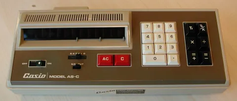 Casio were the first to produce calcutors of this design with the display at the side of the keyboard. This was one of a series of similar looking designs but with gradually advancing electronics. Some were produced for Commodore and Remington.