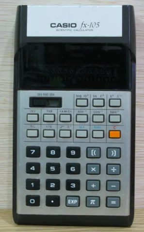The Casio fx-105 is a scientific calculator with 9 digits precision and algebraic logic. It has 32 functions, 35 keys and a VFD (vacuum fluorescent) display. The power source is 2xAA batteries.