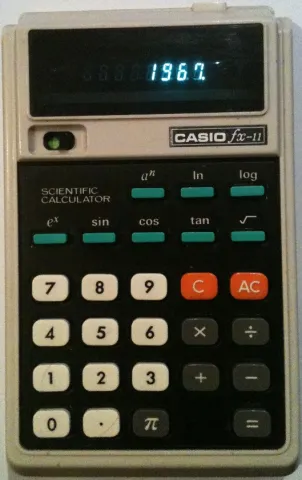 The Casio fx-11 is a scientific calculator with 8 digits precision and algebraic logic. It has 13 functions, 27 keys and a VFD (vacuum fluorescent) display. The power source is 4xAA batteries. The calculator was manufactured in Japan.