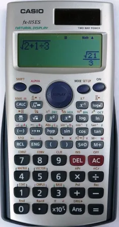 The Casio fx-115ES Natural Display is a scientific calculator with 12 digits precision and formula input logic. It has 300 functions, 50 keys and an LCD (liquid crystal) display. The power source is Solar + LR44. The calculator was manufactured in China.