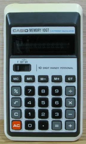 The Casio MEMORY-10GT is an arithmetic calculator with 10 digits precision and algebraic logic. It has 7 functions, 25 keys and a VFD (vacuum fluorescent) display.