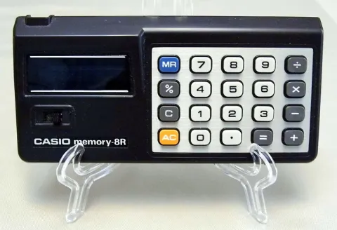 The Casio memory-8R Y-811 is an arithmetic calculator with 8 digits precision and algebraic logic. It has 5 functions, 20 keys and a VFD (vacuum fluorescent) display. The power source is 2xAA batteries. The calculator was manufactured in Japan.