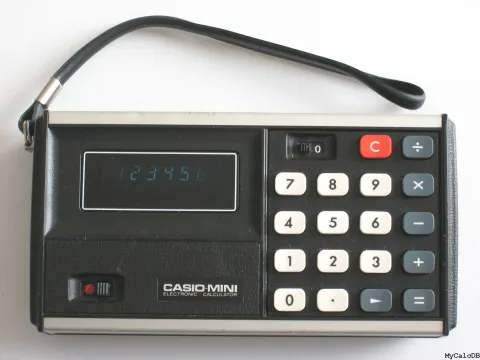The Casio MINI is an arithmetic calculator with 6 digits precision and algebraic logic. It has 5 functions, 16 keys and a VFD (vacuum fluorescent) display. The power source is 4xAA batteries. The calculator was manufactured in Japan.