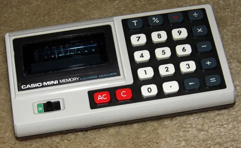 The Casio MINI MEMORY is an arithmetic calculator with 8 digits precision and algebraic logic. It has 6 functions, 22 keys and a VFD (vacuum fluorescent) display. The power source is 4xAA batteries. The calculator was manufactured in Japan.