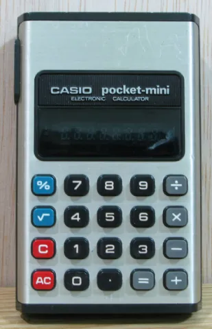The Casio pocket-mini CP-801B CP-801B is an arithmetic calculator with 8 digits precision and algebraic logic. It has 6 functions, 20 keys and a VFD (vacuum fluorescent) display. The power source is 2xAA batteries. The calculator was manufactured in Japan.