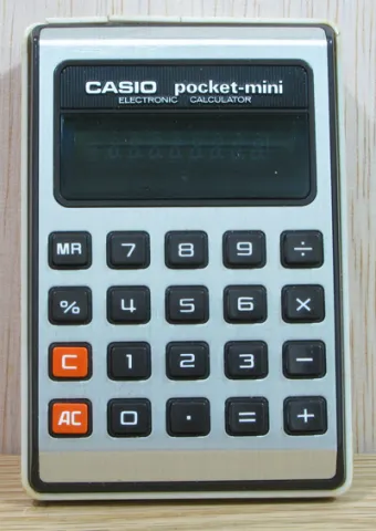 The Casio pocket-mini P-812 P-812 is an arithmetic calculator with 8 digits precision and algebraic logic. It has 5 functions, 20 keys and a VFD (vacuum fluorescent) display. The power source is AA batteries. The calculator was manufactured in Japan.