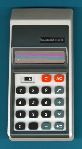 The Casio ROOT-8S is an arithmetic calculator with 8 digits precision and algebraic logic. It has 5 functions, 18 keys and an LED (light-emitting diode) display, typical of calculators of this era. The power source is 4xAA batteries. The calculator was manufactured in Japan.