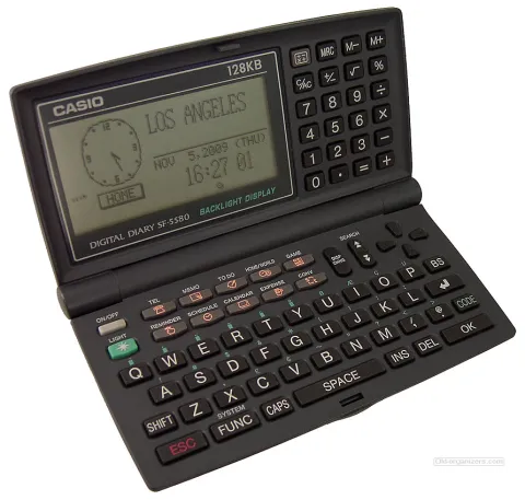 This is a big and heavy organiser with quite a lot of functions, 128KB of memory, a backlit display and even a game (Poker).