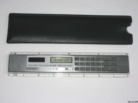 The Citizen RL-1 RULER CALCULATOR is an arithmetic calculator with 8 digits precision and algebraic logic. It has 7 functions, 24 keys and an LCD (liquid crystal) display. The calculator was manufactured in Taiwan.
