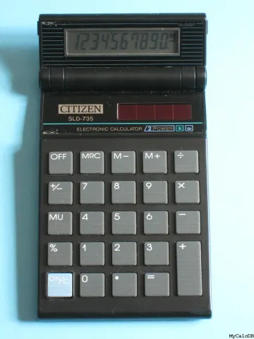 The Citizen SLD-735 is an arithmetic calculator with 10 digits precision and algebraic logic. It has 7 functions, 24 keys and an LCD (liquid crystal) display. The power source is LR44 1.5V. The calculator was manufactured in Taiwan.