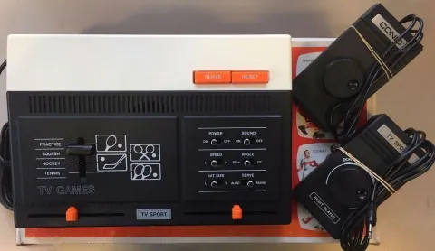 This system comes from Germany (uses the GI AY-3-8500 chip) but many clones exist in several other countries and it was a quite common system in Europe. The detachable controllers have their own cable storage at their back and the main unit has got a large storage for the video cable.