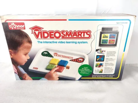 All HardwareThe VideoSmarts was Connor's first edutainment console, released in 1986. It was the first game console in the world to use VHS tapes to hold the game data. The console had four large buttons and a built-in speaker. It was connected to the audio output of the VCR in order to receive signals from the tape. The main character was a puppet known as Teachin' Teddy. This puppet often played the role of a young child who would learn the lessons alongside the viewer. Teachin' Teddy was accompanied by Roger Parrot and Penelope Goldfish. They would often speak to the viewer directly and pose the questions. The signals from through the audio line would tell the console, which was the correct answer, and a calm voice from the internal speaker would tell the user whether they got the answer correct.