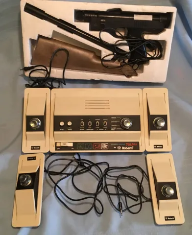 Roberts Super Color Volley X was a pong console released by Dyn Electronics, Inc. in 1977. It has a rifle/pistol light gun, and can play 5 games. The gun hasn't got orange plastic so it could be mistaken for a real thing. He noted that it is powered by batteries. The sound comes out of the console, not the TV.