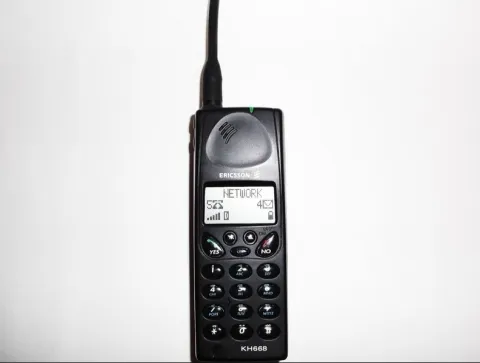 The Sony ERICSSON KH668 cordless phone was released in 1999. It is a heavy, rectangular black phone of a classic design, with a long antenna. The ERICSSON logo is printed in white lettering above the display screen, and the model name can be found in the lower right corner. This device also uses a cell phone charger and is compatible with a range of accessories. It is equipped with the ability to hold calls, tell time and set an alarm. However, there is no built-in memory, QWERTY board, or camera.