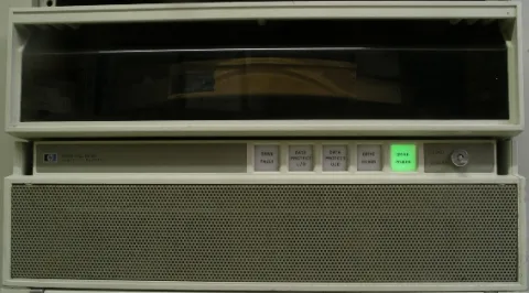 The 7900A was a combination disc drive with a fixed hard disc and a removable hard disc platter. It had a total storage capacity of 4.9MB. The 7900A had an average access time of 35ms and a data transfer rate of 245K per second. The 7900A had an external power supply (P/N 13215A, included in the price). The 7901A (introduced in 1972) had a single, removable platter with no fixed disc, and an integrated power supply.