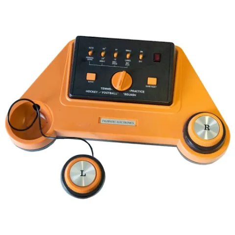 Ingersoll TV Game R-1800 is a nicely shaped Pong Console from 1977. It has the usual Tennis, Football, Squash and Practice, but adds the more unusual Hockey. Controls include a manual serve button, game reset, and then switches for auto or manual serve, angle, ball speed, bat size, and on and off switch. The two rotary controllers can be used clipped to the console, or can be held in the hand attached by a wire, which is very hard to get back in again.
