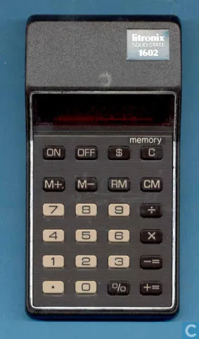 The Litronix 1602 memory is an arithmetic calculator with 8 digits precision and algebraic logic. It has 6 functions, 24 keys and an LED (light-emitting diode) display, typical of calculators of this era. The power source is PP3 9V.