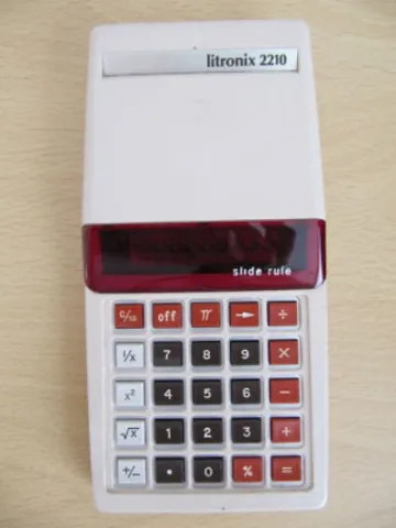 The Litronix 2210 slide rule is an arithmetic calculator with 8 digits precision and algebraic logic. It has 11 functions, 25 keys and an LED (light-emitting diode) display, typical of calculators of this era. The power source is 3xAA batteries.