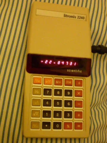 The Litronix 2240 scientific is an arithmetic calculator with 8 digits precision and algebraic logic. It has 9 functions, 25 keys and an LED (light-emitting diode) display, typical of calculators of this era. The power source is Sealed battery pack.