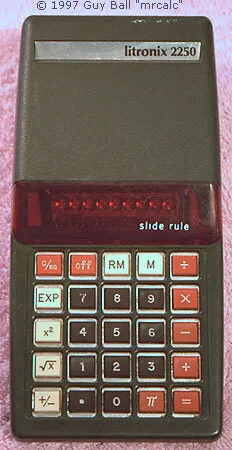 The Litronix 2250 slide rule is an arithmetic calculator with 8 digits precision and algebraic logic. It has 9 functions, 25 keys and an LED (light-emitting diode) display, typical of calculators of this era. The power source is 3xAA batteries.
