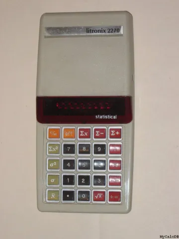 The Litronix 2270 statistical is an arithmetic calculator with 8 digits precision and algebraic logic. It has 5 functions, 25 keys and an LED (light-emitting diode) display, typical of calculators of this era. The power source is 3xAA batteries.