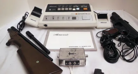 Rare vintage Monteverdi TV Sports 825 game console made by Lloyd’s and released in 1976. (6) games including Tennis, Hockey, Squash, Shooting Gallery, Trap Shooting and Practice.