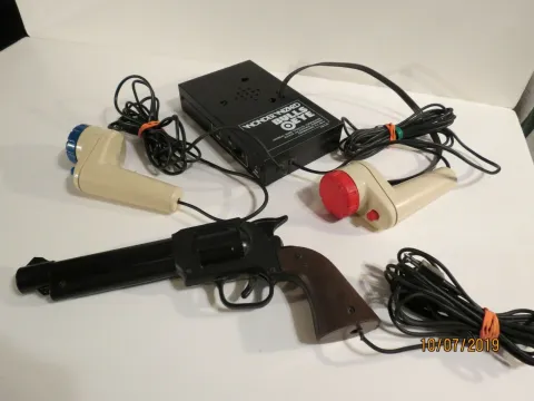 Wonder Wizard Bulls Eye (model 7704) had a rather unique small metal case allowing them to be attached on a side of the TV set. It used the General Instruments AY-3-8500chip, came with a light gun and played the six games of the chip. Model 7704 played the games in black and white.