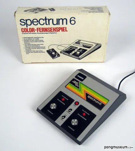 The Spectrum 6 build by "match" is a very unusual pong console. It is designed to the limits, it has a game seletor button and two switches: one to power it on and one to define if you like to play the games in one or two player mode. You can play all three games in single player mode - the console was sold as "including 6 games" - Tennis, Hockey and Handball for one or two players = 6 games