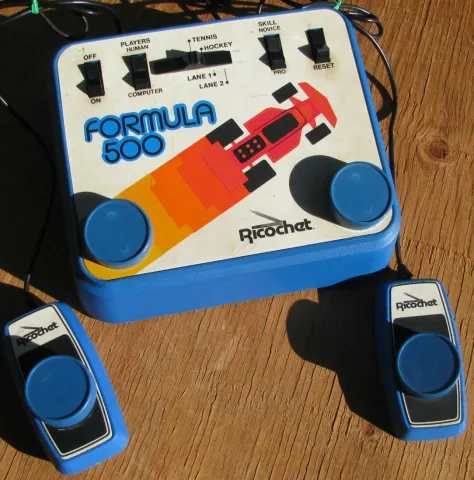 The Ricochet Formula 500 (Model MT-5) was a pong console released in 1976 by Microelectronic Systems Corporation. Plays 2 Pong games and 2 racing games.