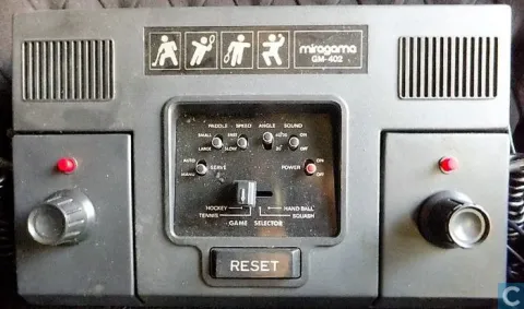 Miragame GM-402 is a dedicated console playing four Pong variants. The console uses the AY-3-8500 dedicated pong chip but implements only the paddle and ball games: Hockey, Tennis, Squash and Hand Ball. Settings allow for paddle size, ball speed sound and manual serve.