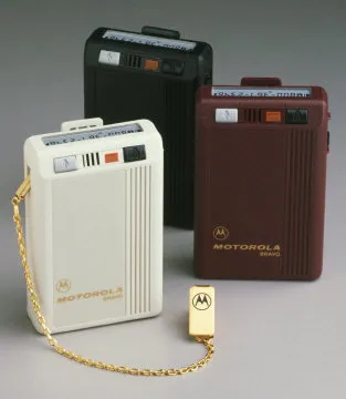 Motorola Bravo is a paging device released by Motorola in 1986. This one has a two-line alphanumeric LCD display and scrolls messages from right to left or up and down, as you prefer. It can either receive pages silently and discreetly, or it can signal a new message by vibrating or beeping. It runs off a small AAA-type battery that goes in the slot at the bottom and provides about a month of power.