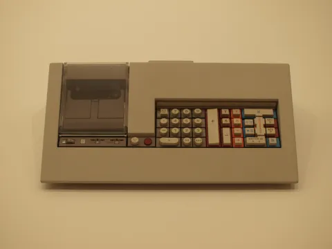 Uses a small rotating print head with 2 rows of 12 characters each. The upper row has the numerals 0 to 9, decimal point and comma, the lower row has special symbols. It uses a standard 75 mm wide paper with an one-color ink ribbon cartridge and prints 20 columns of digits and 2 special columns for symbols. There is a translucid plastic cover to protect the unit.