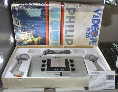 The Philips N20 is a classic pong system offering the 6 games of the widely used General Instruments AY-3-8500 dedicated chip. The black & white games are: Tennis, Football (soccer), Pelote Basque (squash), Exercice (squash practice), Tir au pigeon (skeet) and Tir de cible (shooting on moving target). The two last games are only playable with the optional light gun.