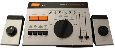 Prinztronic Tournament II De Luxe is a basic Pong clone, based around the ubiquitous General Instruments AY-3-8500 chip. Offers the standard variety of games, plus two sliders for keeping score (the sliders are not connected to anything and do nothing else).